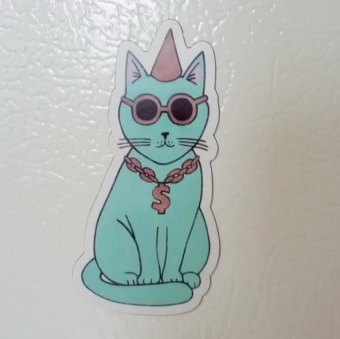 I draw quirky cat designs and turn them into stickers, magnets, keychains, and whatnot. This process begins with sketching out ideas, then choosing the ones I like best. From there, I refine them until I’m satisfied. Then they get finalized with ink and/or colored pencil.